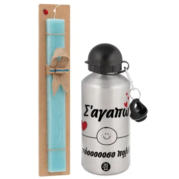 Σ΄αγαπώ τόοοοσο πολύ (Αγόρι)!!!, Πασχαλινή Λαμπάδα με παγούρι μεταλλικό Ασημένιο αλουμινίου (500ml) & κερί αρωματικό πλακέ (30cm) (ΤΙΡΚΟΥΑΖ)