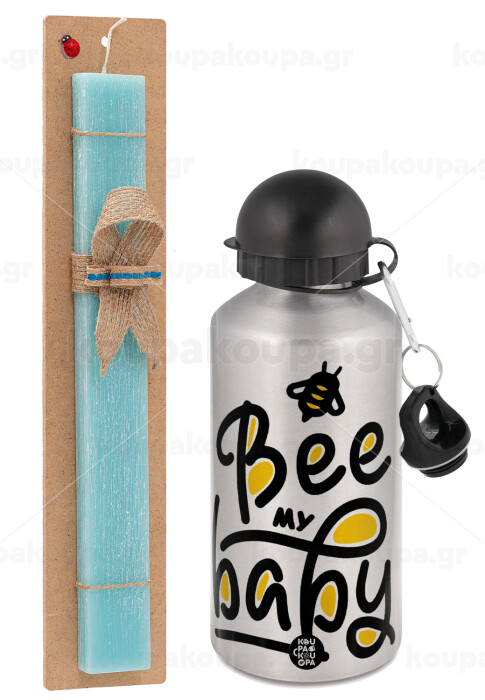 Bee my BABY!!!, Πασχαλινή Λαμπάδα με παγούρι μεταλλικό Ασημένιο αλουμινίου (500ml) & κερί αρωματικό πλακέ (30cm) (ΤΙΡΚΟΥΑΖ)