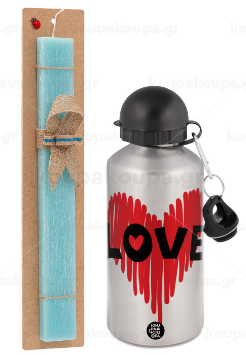 I Love You red heart, Πασχαλινή Λαμπάδα με παγούρι μεταλλικό Ασημένιο αλουμινίου (500ml) & κερί αρωματικό πλακέ (30cm) (ΤΙΡΚΟΥΑΖ)