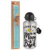 I love you to the moon and back, Πασχαλινή Λαμπάδα με παγούρι μεταλλικό Ασημένιο αλουμινίου (500ml) & κερί αρωματικό πλακέ (30cm) (ΤΙΡΚΟΥΑΖ)