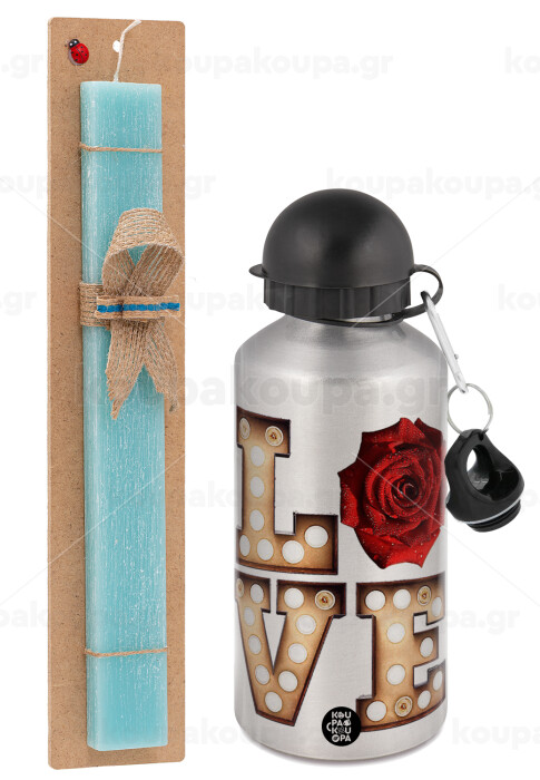 Love lights and roses, Πασχαλινή Λαμπάδα με παγούρι μεταλλικό Ασημένιο αλουμινίου (500ml) & κερί αρωματικό πλακέ (30cm) (ΤΙΡΚΟΥΑΖ)