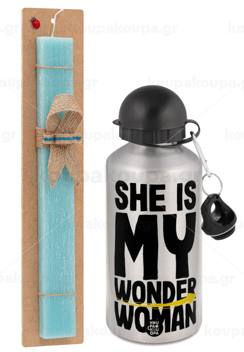 She is my wonder woman, Πασχαλινή Λαμπάδα με παγούρι μεταλλικό Ασημένιο αλουμινίου (500ml) & κερί αρωματικό πλακέ (30cm) (ΤΙΡΚΟΥΑΖ)