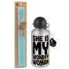 She is my wonder woman, Πασχαλινή Λαμπάδα με παγούρι μεταλλικό Ασημένιο αλουμινίου (500ml) & κερί αρωματικό πλακέ (30cm) (ΤΙΡΚΟΥΑΖ)