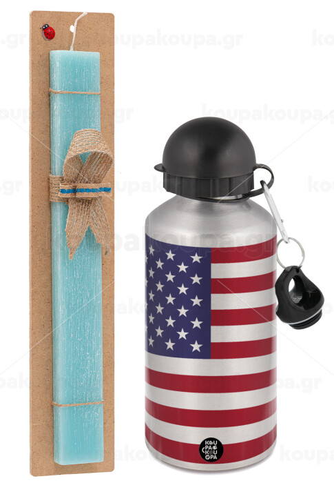 Σημαία Αμερικής, Πασχαλινή Λαμπάδα με παγούρι μεταλλικό Ασημένιο αλουμινίου (500ml) & κερί αρωματικό πλακέ (30cm) (ΤΙΡΚΟΥΑΖ)