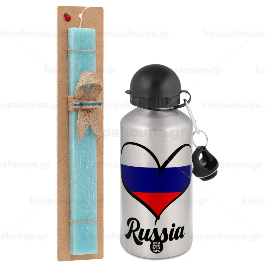 Russia flag, Πασχαλινή Λαμπάδα με παγούρι μεταλλικό Ασημένιο αλουμινίου (500ml) & κερί αρωματικό πλακέ (30cm) (ΤΙΡΚΟΥΑΖ)