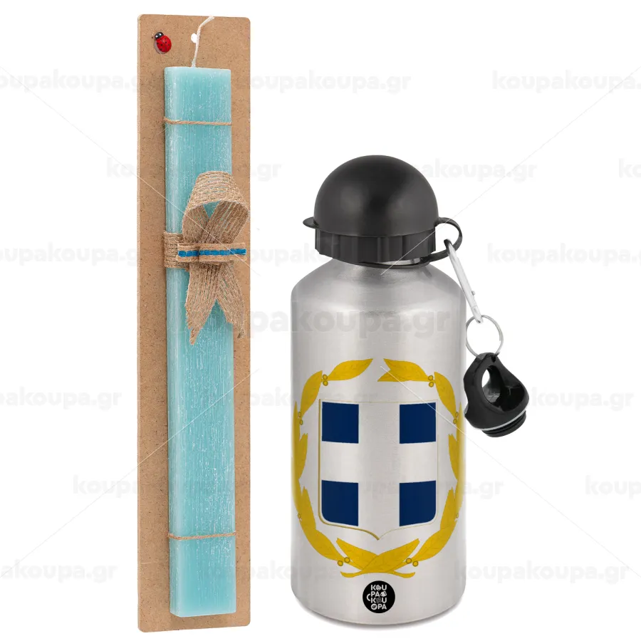 Hellas Εθνόσημο, Πασχαλινή Λαμπάδα με παγούρι μεταλλικό Ασημένιο αλουμινίου (500ml) & κερί αρωματικό πλακέ (30cm) (ΤΙΡΚΟΥΑΖ)