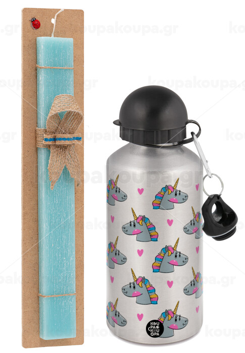 Unicorn, Πασχαλινή Λαμπάδα με παγούρι μεταλλικό Ασημένιο αλουμινίου (500ml) & κερί αρωματικό πλακέ (30cm) (ΤΙΡΚΟΥΑΖ)