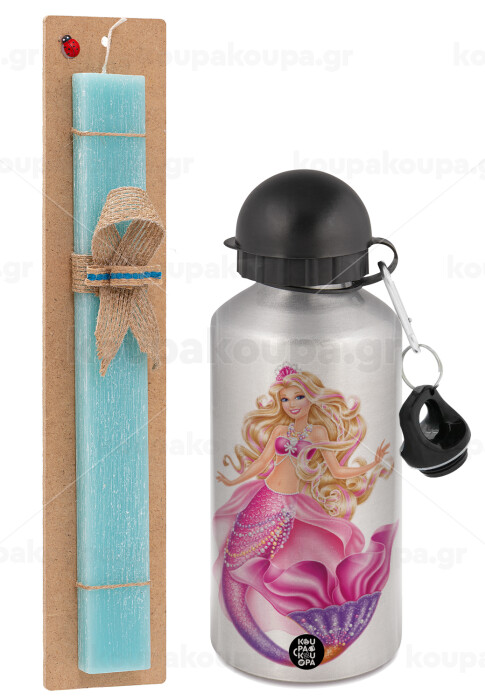 Barbie γοργόνα , Πασχαλινή Λαμπάδα με παγούρι μεταλλικό Ασημένιο αλουμινίου (500ml) & κερί αρωματικό πλακέ (30cm) (ΤΙΡΚΟΥΑΖ)