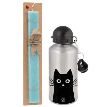 Μαύρη γάτα, Πασχαλινή Λαμπάδα με παγούρι μεταλλικό Ασημένιο αλουμινίου (500ml) & κερί αρωματικό πλακέ (30cm) (ΤΙΡΚΟΥΑΖ)
