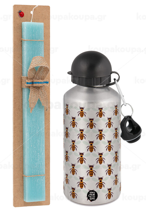 Μελισσούλες, Πασχαλινή Λαμπάδα με παγούρι μεταλλικό Ασημένιο αλουμινίου (500ml) & κερί αρωματικό πλακέ (30cm) (ΤΙΡΚΟΥΑΖ)