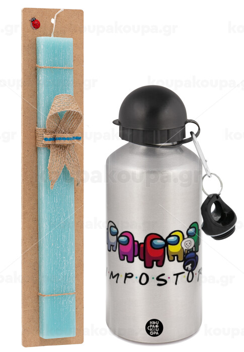 Among US impostor, Πασχαλινή Λαμπάδα με παγούρι μεταλλικό Ασημένιο αλουμινίου (500ml) & κερί αρωματικό πλακέ (30cm) (ΤΙΡΚΟΥΑΖ)