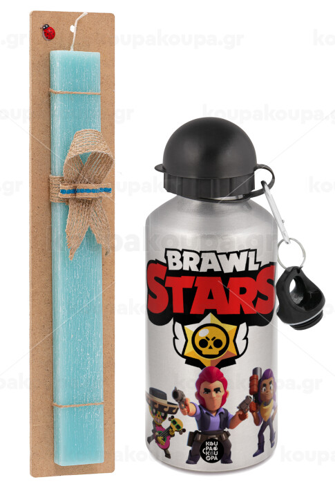 Brawl Stars Desert, Πασχαλινή Λαμπάδα με παγούρι μεταλλικό Ασημένιο αλουμινίου (500ml) & κερί αρωματικό πλακέ (30cm) (ΤΙΡΚΟΥΑΖ)