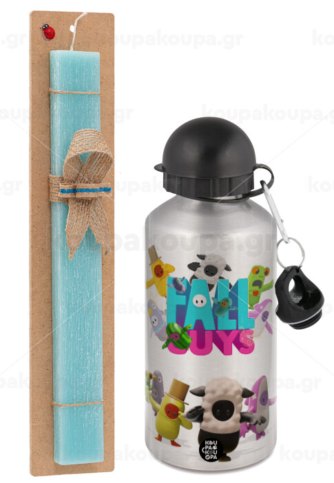 FALL GUYS, Πασχαλινή Λαμπάδα με παγούρι μεταλλικό Ασημένιο αλουμινίου (500ml) & κερί αρωματικό πλακέ (30cm) (ΤΙΡΚΟΥΑΖ)