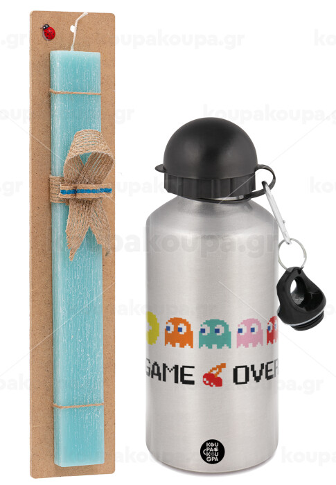 GAME OVER pac-man, Πασχαλινή Λαμπάδα με παγούρι μεταλλικό Ασημένιο αλουμινίου (500ml) & κερί αρωματικό πλακέ (30cm) (ΤΙΡΚΟΥΑΖ)