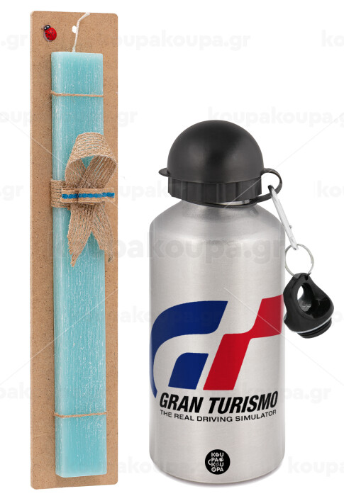 gran turismo, Πασχαλινή Λαμπάδα με παγούρι μεταλλικό Ασημένιο αλουμινίου (500ml) & κερί αρωματικό πλακέ (30cm) (ΤΙΡΚΟΥΑΖ)