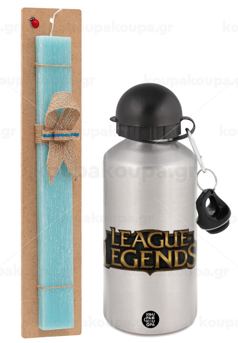 League of Legends LoL, Πασχαλινή Λαμπάδα με παγούρι μεταλλικό Ασημένιο αλουμινίου (500ml) & κερί αρωματικό πλακέ (30cm) (ΤΙΡΚΟΥΑΖ)