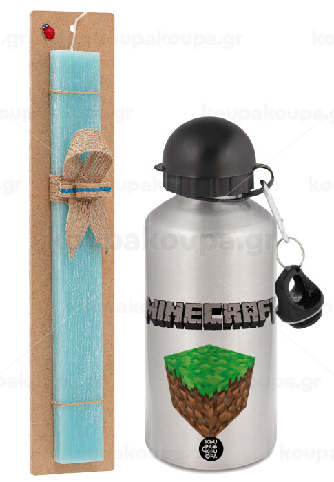 Minecraft dirt, Πασχαλινή Λαμπάδα με παγούρι μεταλλικό Ασημένιο αλουμινίου (500ml) & κερί αρωματικό πλακέ (30cm) (ΤΙΡΚΟΥΑΖ)