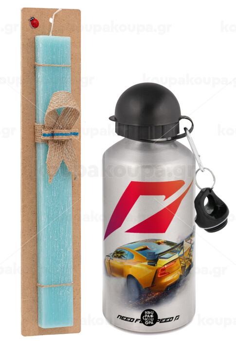 Need For Speed, Πασχαλινή Λαμπάδα με παγούρι μεταλλικό Ασημένιο αλουμινίου (500ml) & κερί αρωματικό πλακέ (30cm) (ΤΙΡΚΟΥΑΖ)