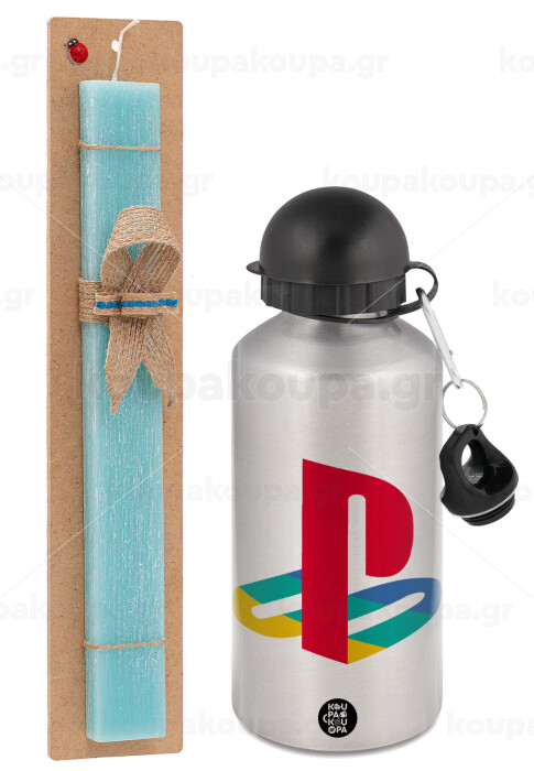 Playstation, Πασχαλινή Λαμπάδα με παγούρι μεταλλικό Ασημένιο αλουμινίου (500ml) & κερί αρωματικό πλακέ (30cm) (ΤΙΡΚΟΥΑΖ)