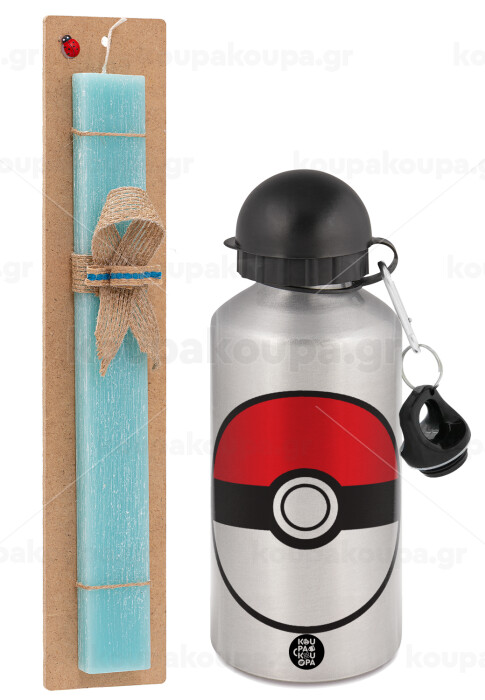 Pokemon ball, Πασχαλινή Λαμπάδα με παγούρι μεταλλικό Ασημένιο αλουμινίου (500ml) & κερί αρωματικό πλακέ (30cm) (ΤΙΡΚΟΥΑΖ)