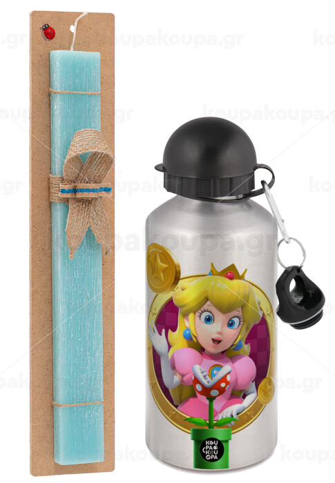 Princess Peach Toadstool, Πασχαλινή Λαμπάδα με παγούρι μεταλλικό Ασημένιο αλουμινίου (500ml) & κερί αρωματικό πλακέ (30cm) (ΤΙΡΚΟΥΑΖ)
