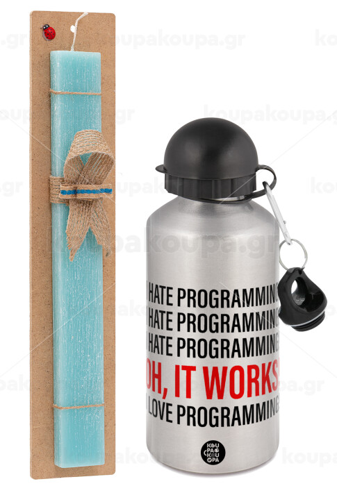 I hate programming!!!, Πασχαλινή Λαμπάδα με παγούρι μεταλλικό Ασημένιο αλουμινίου (500ml) & κερί αρωματικό πλακέ (30cm) (ΤΙΡΚΟΥΑΖ)