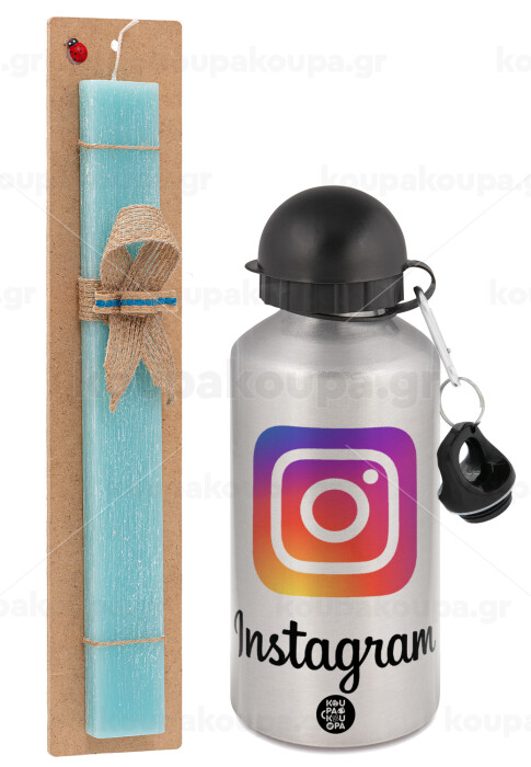 Instagram, Πασχαλινή Λαμπάδα με παγούρι μεταλλικό Ασημένιο αλουμινίου (500ml) & κερί αρωματικό πλακέ (30cm) (ΤΙΡΚΟΥΑΖ)