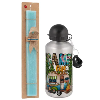 Camp Life, Πασχαλινή Λαμπάδα με παγούρι μεταλλικό Ασημένιο αλουμινίου (500ml) & κερί αρωματικό πλακέ (30cm) (ΤΙΡΚΟΥΑΖ)