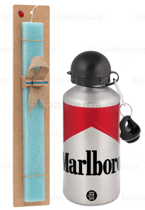 Marlboro, Πασχαλινή Λαμπάδα με παγούρι μεταλλικό Ασημένιο αλουμινίου (500ml) & κερί αρωματικό πλακέ (30cm) (ΤΙΡΚΟΥΑΖ)