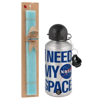 I need my space, Πασχαλινή Λαμπάδα με παγούρι μεταλλικό Ασημένιο αλουμινίου (500ml) & κερί αρωματικό πλακέ (30cm) (ΤΙΡΚΟΥΑΖ)