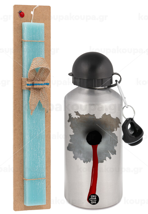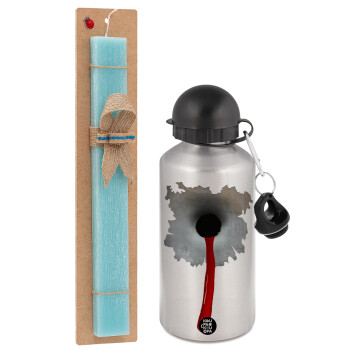 Bullet holes, Πασχαλινή Λαμπάδα με παγούρι μεταλλικό Ασημένιο αλουμινίου (500ml) & κερί αρωματικό πλακέ (30cm) (ΤΙΡΚΟΥΑΖ)
