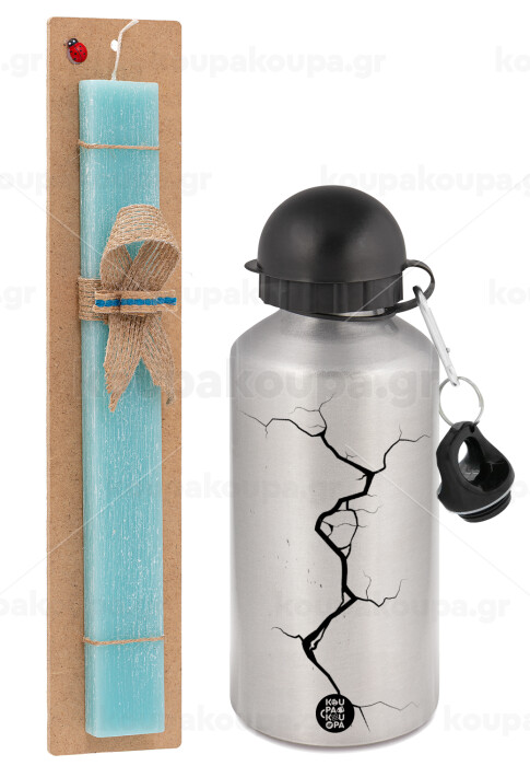 Cracked, Πασχαλινή Λαμπάδα με παγούρι μεταλλικό Ασημένιο αλουμινίου (500ml) & κερί αρωματικό πλακέ (30cm) (ΤΙΡΚΟΥΑΖ)