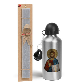 Ιησούς, Πασχαλινή Λαμπάδα με παγούρι μεταλλικό Ασημένιο αλουμινίου (500ml) & κερί αρωματικό πλακέ (30cm) (ΓΚΡΙ)