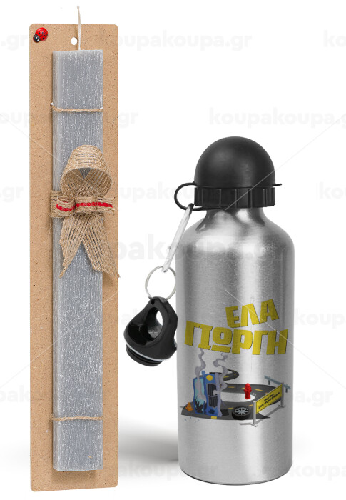 Έλα Γιώργη, πω πω μια στροφάρα, Πασχαλινή Λαμπάδα με παγούρι μεταλλικό Ασημένιο αλουμινίου (500ml) & κερί αρωματικό πλακέ (30cm) (ΓΚΡΙ)