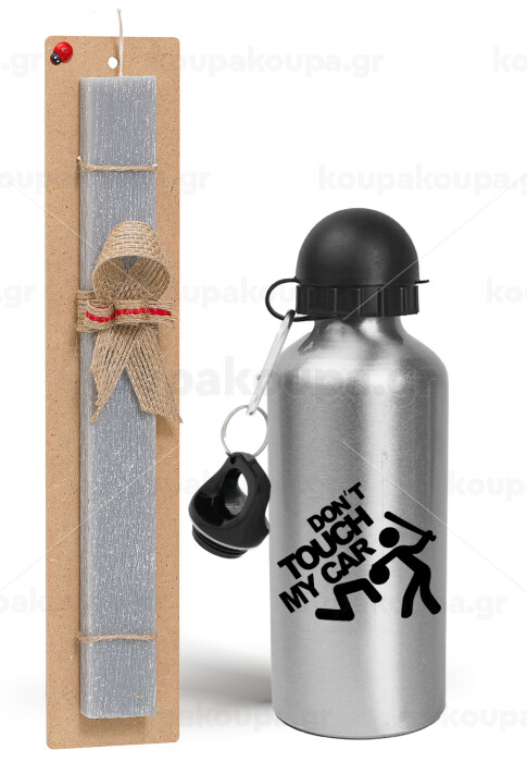 Don't touch my car, Πασχαλινή Λαμπάδα με παγούρι μεταλλικό Ασημένιο αλουμινίου (500ml) & κερί αρωματικό πλακέ (30cm) (ΓΚΡΙ)