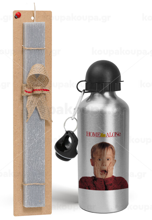 Μόνος στο σπίτι Kevin McCallister Shocked, Πασχαλινή Λαμπάδα με παγούρι μεταλλικό Ασημένιο αλουμινίου (500ml) & κερί αρωματικό πλακέ (30cm) (ΓΚΡΙ)