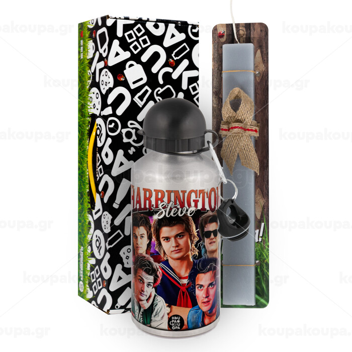 Steve Harrington, Stranger Things, Πασχαλινή Λαμπάδα με παγούρι μεταλλικό Ασημένιο αλουμινίου (500ml) & κερί αρωματικό πλακέ (30cm) (ΓΚΡΙ)