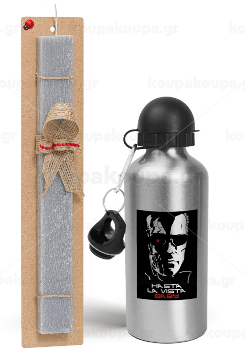 Terminator Hasta La Vista, Πασχαλινή Λαμπάδα με παγούρι μεταλλικό Ασημένιο αλουμινίου (500ml) & κερί αρωματικό πλακέ (30cm) (ΓΚΡΙ)