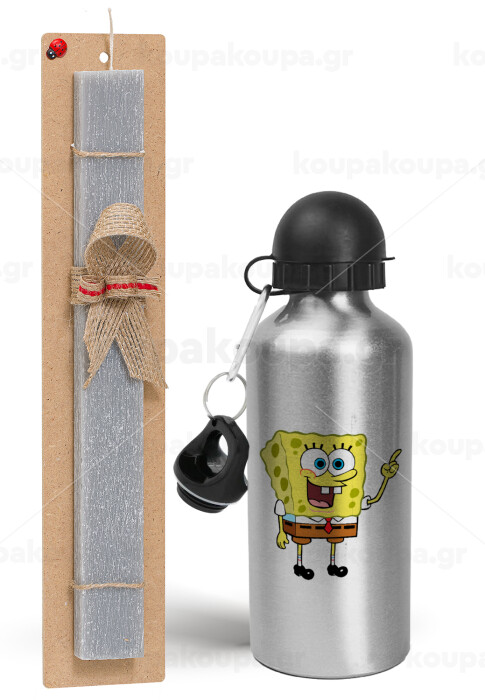Μπομπ Σφουγγαράκης character, Πασχαλινή Λαμπάδα με παγούρι μεταλλικό Ασημένιο αλουμινίου (500ml) & κερί αρωματικό πλακέ (30cm) (ΓΚΡΙ)
