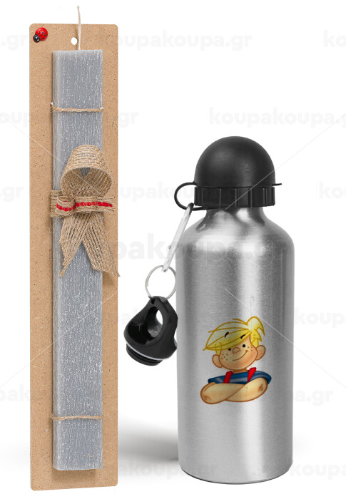 Ντένις ο τρομερός, Πασχαλινή Λαμπάδα με παγούρι μεταλλικό Ασημένιο αλουμινίου (500ml) & κερί αρωματικό πλακέ (30cm) (ΓΚΡΙ)