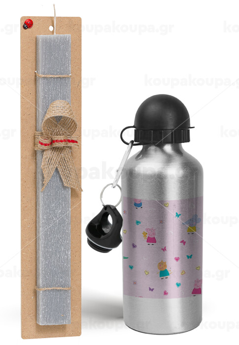 Πέππα το γουρουνάκι και οι φίλοι της, Πασχαλινή Λαμπάδα με παγούρι μεταλλικό Ασημένιο αλουμινίου (500ml) & κερί αρωματικό πλακέ (30cm) (ΓΚΡΙ)