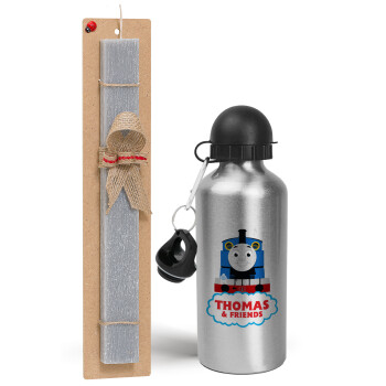 Τόμας το τρενάκι, Πασχαλινή Λαμπάδα με παγούρι μεταλλικό Ασημένιο αλουμινίου (500ml) & κερί αρωματικό πλακέ (30cm) (ΓΚΡΙ)