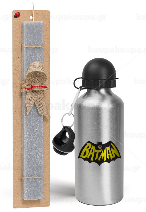 Batman classic logo, Πασχαλινή Λαμπάδα με παγούρι μεταλλικό Ασημένιο αλουμινίου (500ml) & κερί αρωματικό πλακέ (30cm) (ΓΚΡΙ)