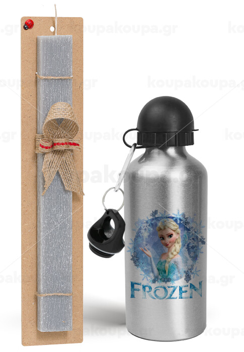 Frozen Elsa, Πασχαλινή Λαμπάδα με παγούρι μεταλλικό Ασημένιο αλουμινίου (500ml) & κερί αρωματικό πλακέ (30cm) (ΓΚΡΙ)