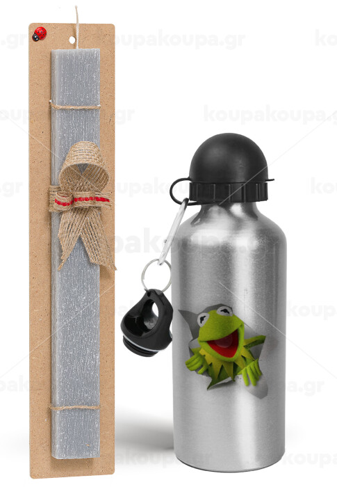 Kermit the frog, Πασχαλινή Λαμπάδα με παγούρι μεταλλικό Ασημένιο αλουμινίου (500ml) & κερί αρωματικό πλακέ (30cm) (ΓΚΡΙ)