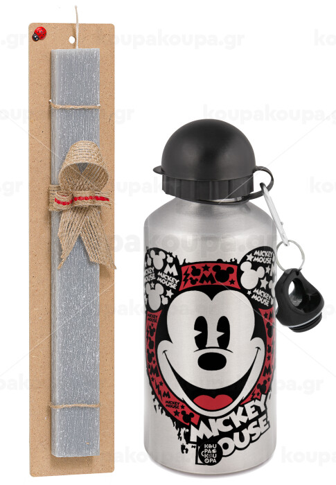 Mickey Mouse, Πασχαλινή Λαμπάδα με παγούρι μεταλλικό Ασημένιο αλουμινίου (500ml) & κερί αρωματικό πλακέ (30cm) (ΓΚΡΙ)