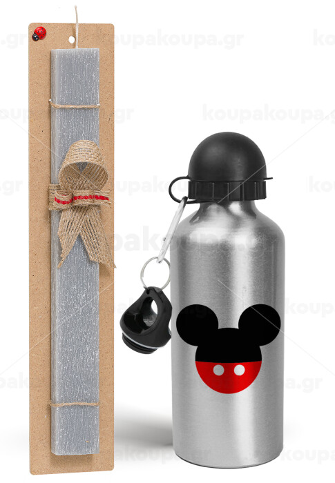 Mickey head, Πασχαλινή Λαμπάδα με παγούρι μεταλλικό Ασημένιο αλουμινίου (500ml) & κερί αρωματικό πλακέ (30cm) (ΓΚΡΙ)