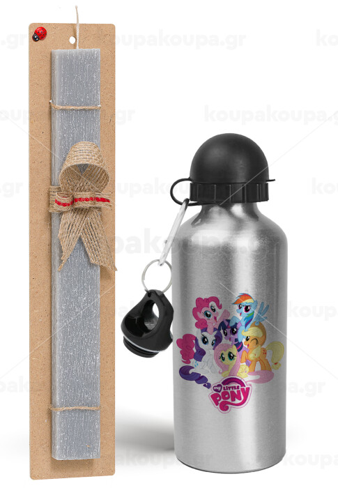 My Little Pony, Πασχαλινή Λαμπάδα με παγούρι μεταλλικό Ασημένιο αλουμινίου (500ml) & κερί αρωματικό πλακέ (30cm) (ΓΚΡΙ)