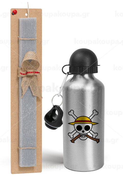 Onepiece skull, Πασχαλινή Λαμπάδα με παγούρι μεταλλικό Ασημένιο αλουμινίου (500ml) & κερί αρωματικό πλακέ (30cm) (ΓΚΡΙ)