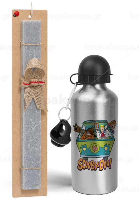 Scooby Doo car, Πασχαλινή Λαμπάδα με παγούρι μεταλλικό Ασημένιο αλουμινίου (500ml) & κερί αρωματικό πλακέ (30cm) (ΓΚΡΙ)